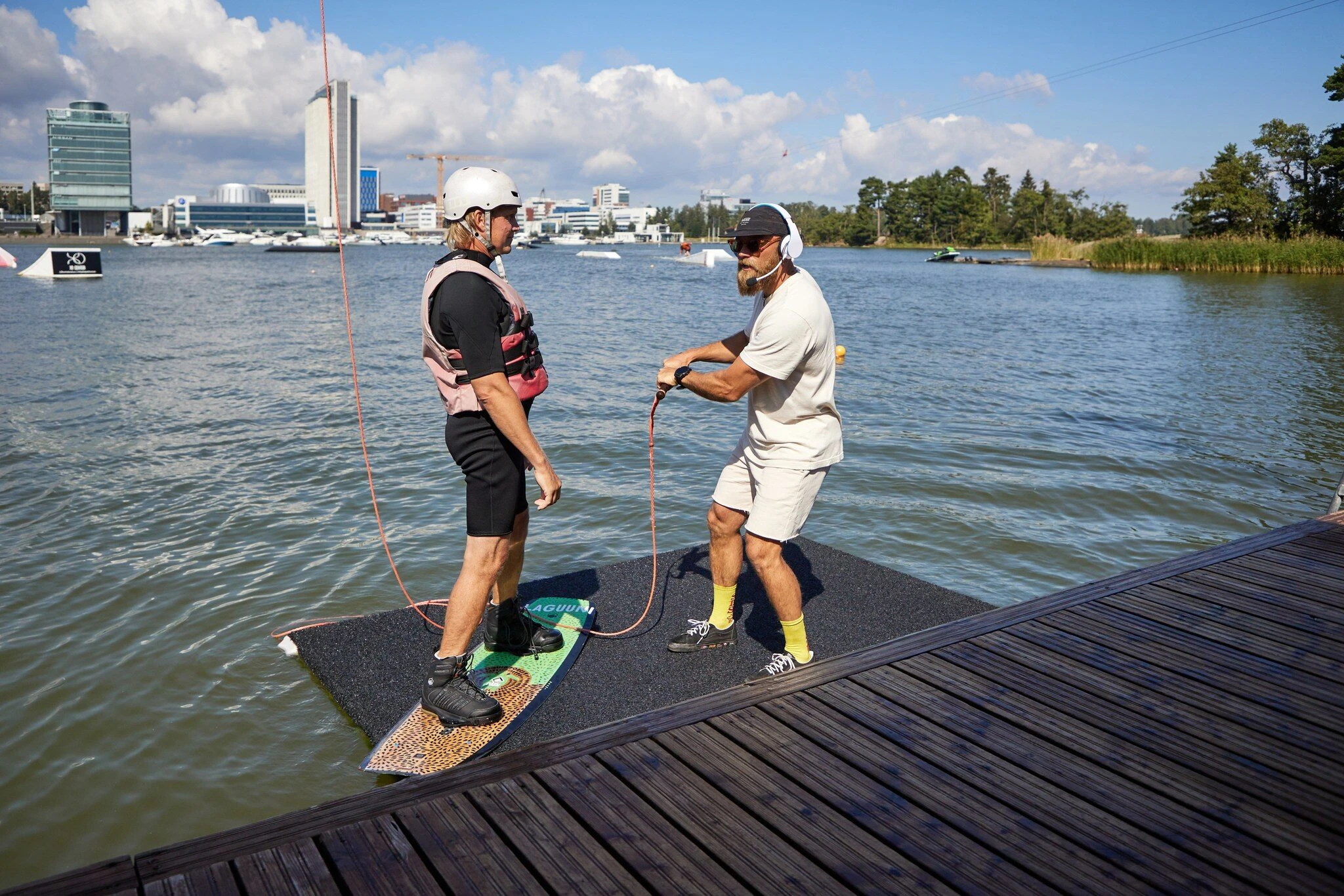 Hinta 150e sisältää: wakeboardauksen kahdella kaapelilla Keilaniemessä 3h, Vesilautailuun soveltuvia alkulämmittelyitä, Videoitten kuvaamista, henkilökohtaista ohjausta.