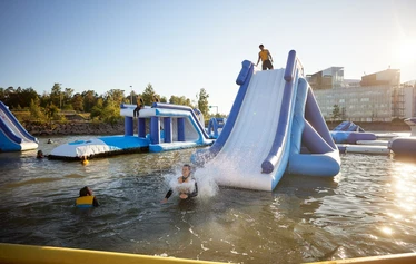 Varaa vesipuistolippuja syntymäpäiväporukallesi. Vesipuistossa temmeltäminen on hauskaa puuhaa kaikille yli 6-vuotiaille uimataitoisille. Rata on suunniteltu moneen tarkoitukseen ja siellä voit esimerkiksi kisailla kavereiden kanssa, roikkua tarzan-liaanilla, laskea jättiliukumäestä, hyppiä vesitrampoliinilla tai vaikkapa vaan nauttia monipuolisista esteistä ja radan antimista. Keilaniemen jättimäiseen kelluvaan vesipuistoon mahtuu kerrallaan 90 henkilöä. Suosittelemme ostamaan koko seurueelle liput ennakkoon, koska vesipuiston suosio on suuri. Hinta alkaen 15e/h/hlö