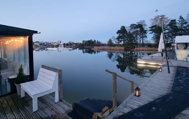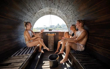 Laguunin sähkölämmitteisessä tynnyrisaunassa pääset nauttimaan merimaisemasta ja suoraan saunan edustalta voit pulahtaa virkistävään avantoon.
